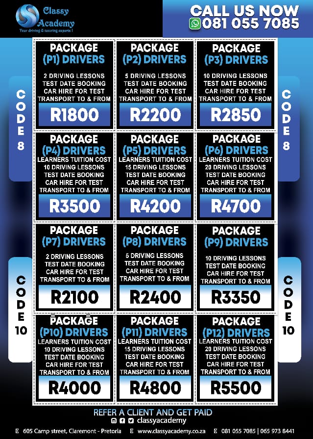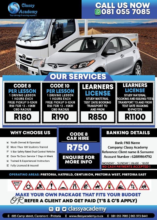 Classy Academy owned and registered business in the Tutoring, Leaner's and driver's licence and has been serving around Pretoria, Centurion and Midrand since 2018. We offer a wide range of packages for licensing programs, driving lessons services, one on one tutoring an group tutoring. We strive for excellence because it is an important part of professionalism in any job.